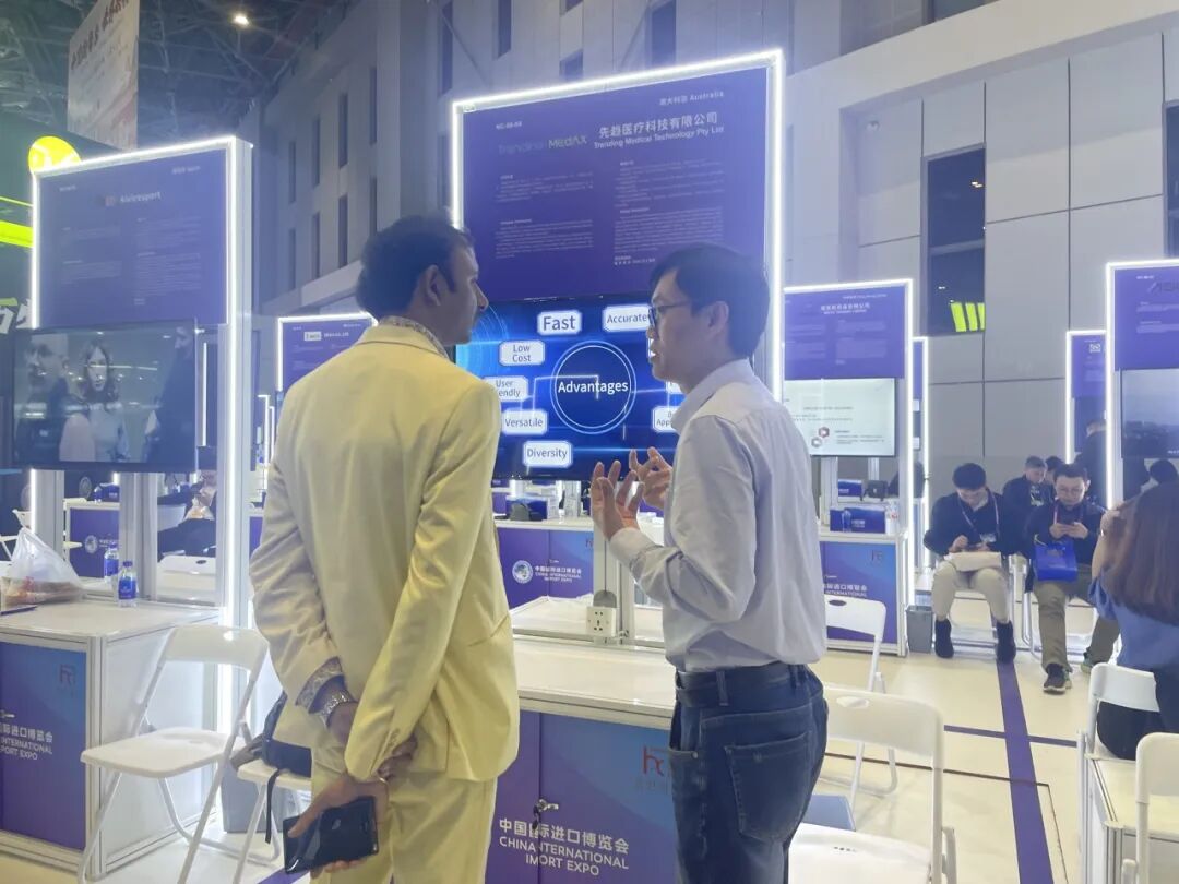作为一家融合中澳科研的高科技企业,先趋医疗的进博展台也充满了国际交流的氛围。来自全球的访客对我们 “将实验室揣进口袋” 的理念表现出浓厚兴趣,并就技术合作、市场落地进行了深度洽谈。