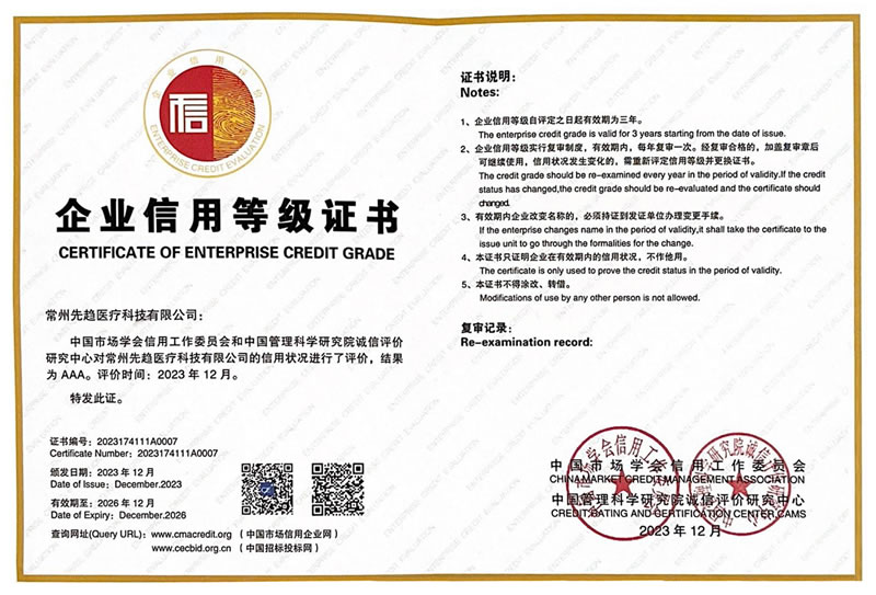 此外,先趋医疗顺利通过了中国市场学会信用工作委员会和中国管理科学研究院诚信评价中心的审核,荣获AAA级“企业信用等级证书”。此次信用标准认定为3A,标志着先趋医疗在市场信用建设管理中所付出的不懈努力以及市场和消费者的信任和肯定。